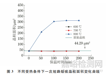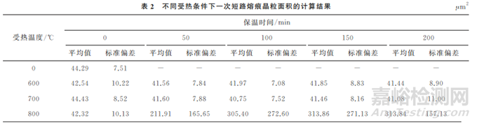 表2為不同受熱條件下一次短路熔痕晶粒面積的計(jì)算結(jié)果,圖3為不同受熱條件下一次短路熔痕晶粒面積的變化曲線。由表2和圖3可知:銅導(dǎo)線一次短路熔痕原始晶粒面積的平均值為44.29μm2;一次短路熔痕在受熱溫度為600℃,保溫時(shí)間為200min時(shí),晶粒面積與原始晶?;疽恢?,未發(fā)生明 顯 變 化;一次短路熔痕在受熱溫度為700 ℃,保溫時(shí)間為200min時(shí),晶粒面積較原始晶粒有所增大;當(dāng)一次短路熔痕受熱至800℃時(shí),隨著保溫時(shí)間的延長,晶粒面積明顯增大,當(dāng)保溫時(shí)間為100min時(shí),晶粒面積測量值的離散系數(shù)為78.17%,說明被測晶粒面積的離散程度較大,該熔痕的晶粒面積分布不均勻,當(dāng)保溫時(shí)間為200min時(shí),晶粒面積較原始晶粒增大了708.61%。
