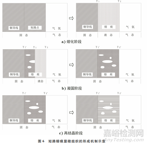 圖6為短路熔痕顯微組織的形成機(jī)制。傳統(tǒng)的熔痕理論認(rèn)為短路熔痕顯微組織在短路時(shí)形成,并在火災(zāi)中穩(wěn)定存在,采用金相檢驗(yàn)方法能夠判定熔痕的熔化性質(zhì),該理論為區(qū)分火場熔痕提供了重要的技術(shù)方向。基于短路熔痕胞狀晶的再結(jié)晶機(jī)制,可將傳統(tǒng)的熔痕理論進(jìn)一步完善,將短路熔痕的形成過程分為3個(gè)階段。