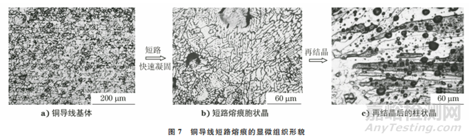 電氣火災(zāi)物證鑒定主要依靠熔痕的宏觀形貌、顯微組織、孔洞特征判定其熔化性質(zhì)。其中,胞狀晶為一次短路熔痕判定的主要依據(jù),柱狀晶為二次短路熔痕判定的主要依據(jù)。銅導(dǎo)線基體的顯微組織為細(xì)小等軸晶,一次短路發(fā)生后因快速凝固而形成細(xì)小胞狀晶,二者差別較大[見圖 7a),7b)]。一次短路熔痕持續(xù)受熱,胞狀晶發(fā)生再結(jié)晶,轉(zhuǎn)變?yōu)橹鶢罹見圖7c)]。柱狀晶是銅導(dǎo)線二次短路熔痕的主要判據(jù)之一,因此僅通過顯微組織判定熔痕,可能將發(fā)生再結(jié)晶轉(zhuǎn) 變的一次短路熔痕誤判為二次短路熔痕。針對(duì)這一情況,在進(jìn)行電氣火災(zāi)物證鑒定時(shí),首先要了解熔痕提取部位的燃燒溫度和燃燒時(shí)間等火場信息,充分了解熔痕在火災(zāi)全過程的受熱過程,結(jié)合熔痕宏觀形貌、內(nèi)部孔洞特征及火場信息綜合判定,得出準(zhǔn)確的鑒定結(jié)論,為火災(zāi)原因認(rèn)定提供科學(xué)的技術(shù)依據(jù)。