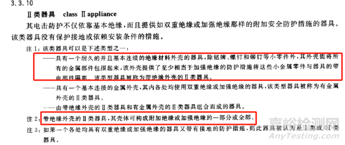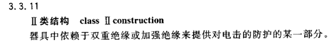 根據(jù)強制性國家標(biāo)準(zhǔn)GB 4706.1-2005的定義,全塑外殼的II類器具(即:以上紅框標(biāo)注出來的類型范圍)主要運用附加絕緣或加強絕緣的防護(hù)措施,而此點與II類結(jié)構(gòu)的電擊防護(hù)措施異曲同工。下面是標(biāo)準(zhǔn)內(nèi)關(guān)于II類結(jié)構(gòu)的定義: