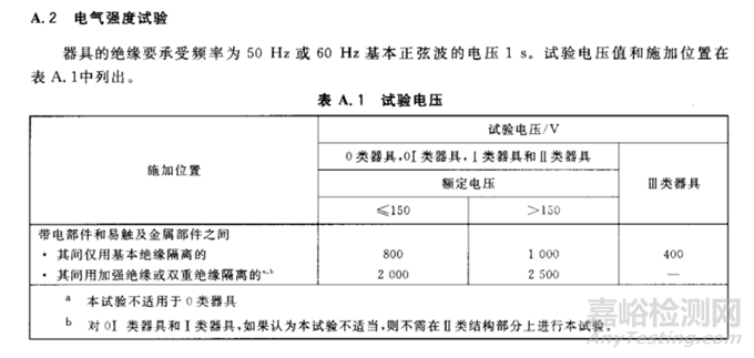 表A.1的注釋b還規(guī)定:“對0I類器具和I類器具,如果認(rèn)為本試驗不適當(dāng),則不需在II類結(jié)構(gòu)部分上進(jìn)行本試驗”。