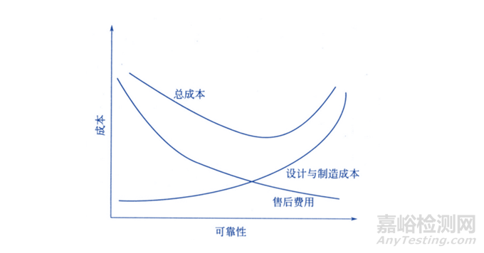 圖4 設(shè)計(jì)與制造成本、售后費(fèi)用及總成本與產(chǎn)品可靠性的關(guān)系