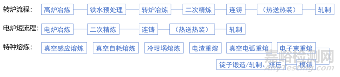 特種合金鋼的生產(chǎn)技術(shù)水平較普通鋼材生產(chǎn)高,生產(chǎn)流程主要包括轉(zhuǎn)爐、電爐和特種熔煉三種。