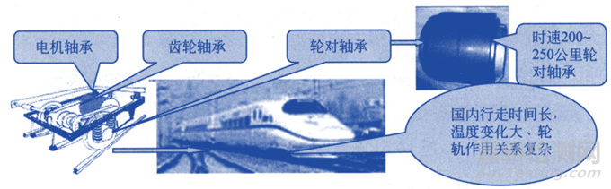 高速列車軸承在高速、高沖擊狀態(tài)下要連續(xù)穩(wěn)定可靠地工作,軸承單元檢修里程要求達(dá)到120萬(wàn)千米以上,因此對(duì)軸承設(shè)計(jì)、軸承材料、軸承制造以及服役評(píng)價(jià)提出更高要求,高鐵軸承材料應(yīng)具備高可靠性、長(zhǎng)壽命、穩(wěn)定性等基本要求。高鐵軸承以及應(yīng)用部位如圖9所示。