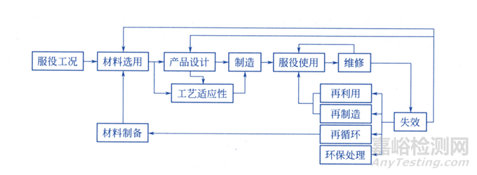 傳統(tǒng)的特種合金鋼產(chǎn)品全壽命周期是“設(shè)計(jì)-選材-制造-使用-維修-報(bào)廢”,其過(guò)程是一個(gè)開(kāi)環(huán)系統(tǒng)。隨著全壽命周期理論的延伸和發(fā)展,形成了新的全壽命周期,即 “設(shè)計(jì)-選材-制造-使用-維修-再生”,其過(guò)程是一個(gè)半閉環(huán)系統(tǒng),如圖7。