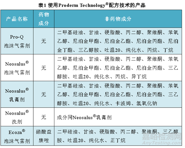 事實(shí)上,上述5種外用制劑產(chǎn)品均使用Proderm Technology®配方技術(shù)。表1總結(jié)對比了Pro-Q泡沫氣霧劑、Neosalus®泡沫氣霧劑、Neosalus®乳膏劑、Neosalus®洗劑和Ecoza®泡沫氣霧劑的處方組成,不難看出這5種產(chǎn)品成分相似度很高。