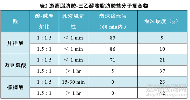Paul. A Sanders[4]研究了在泡沫氣霧劑中使用三乙醇胺與月桂酸(12個碳原子)、肉豆蔻酸(14個碳原子)和棕櫚酸(16個碳原子)這三種長鏈脂肪酸組分的體系對乳液和泡沫的影響(見表2)。結(jié)果表明,月桂酸與三乙醇月桂酸鹽胺無法形成分子復(fù)合物,這可能是水溶性過高所致。游離的肉豆蔻酸與三乙醇月桂酸鹽以及游離的棕櫚酸與三乙醇棕櫚酸鹽均能形成分子復(fù)合物,大大提高了乳液和泡沫的穩(wěn)定性,而如果三乙醇胺過量,則效果不佳。