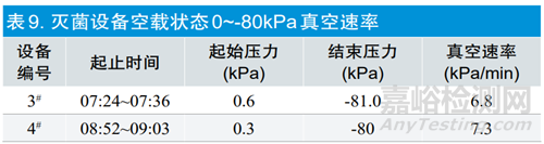 通過(guò)表9可以看出兩臺(tái)滅菌設(shè)備的真空速率基本相同。滅菌過(guò)程尤其是加濕前真空度對(duì)滅菌效果影響非常大,預(yù)真空的大小決定殘留空氣的多少,而殘留空氣可直接影響環(huán)氧乙烷氣體、熱量、濕氣到達(dá)被滅菌物品的深層和腔體內(nèi)部,從而影響產(chǎn)品暴露階段的初始狀態(tài)。此外,真空速率過(guò)快可能造成對(duì)被滅菌產(chǎn)品及其包裝的破壞[5]。