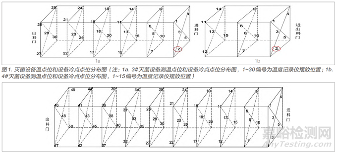 選擇已經(jīng)按照GB 18279.1-2015《醫(yī)療保健產(chǎn)品滅菌 環(huán)氧乙烷 第1部分:醫(yī)療器械滅菌過(guò)程的開發(fā)、確認(rèn)和常規(guī)控制的要求》完成了安裝確認(rèn)和運(yùn)行確認(rèn)的3#滅菌設(shè)備和4#滅菌設(shè)備。按照YY/T 1268-2015 《環(huán)氧乙烷滅菌的產(chǎn)品追加和過(guò)程等效》中5.3過(guò)程等效確定。從設(shè)計(jì)和工程評(píng)估、過(guò)程分析和評(píng)估、微生物評(píng)估三個(gè)方面進(jìn)行分析,評(píng)估經(jīng)4#滅菌設(shè)備確認(rèn)的滅菌參數(shù)是否可以等效到3#滅菌設(shè)備[4]。在過(guò)程分析和評(píng)估中,在3#滅菌設(shè)備空載狀態(tài)下,分別進(jìn)行各點(diǎn)位升溫速率和溫度分布測(cè)試分析。在滅菌設(shè)備空間中均勻放置溫度記錄儀,測(cè)溫點(diǎn)位和設(shè)備冷點(diǎn)點(diǎn)位如圖1所示(圖中圈出點(diǎn)位為冷點(diǎn))。
