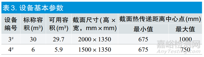 所用的3#與4#環(huán)氧乙烷滅菌設(shè)備均為同一廠家制造,標(biāo)稱容積不同,表3是兩臺(tái)滅菌設(shè)備基本工程參數(shù)。兩臺(tái)設(shè)備的截面尺寸,高度相差500mm,寬度一致,截面尺寸基本相似,長(zhǎng)度是容積的變量,均采用六面體水循環(huán)加熱。兩臺(tái)設(shè)備均采用單排托盤裝載方式,在對(duì)滅菌產(chǎn)品加熱方式上(輻射、傳導(dǎo)、對(duì)流)從中心點(diǎn)到加熱面的最短距離是675mm,最大距離是750~1000mm,距離相差不大。