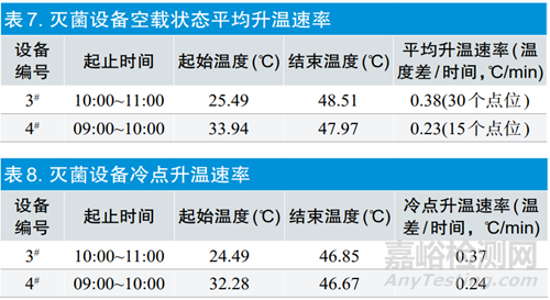 滅菌設(shè)備空載狀態(tài)平均升溫速率數(shù)據(jù)見表7,滅菌設(shè)備冷點(diǎn)升溫速率見表8,3#滅菌設(shè)備平均升溫速率和冷點(diǎn)升溫速率均高于4#滅菌設(shè)備。從產(chǎn)品進(jìn)入設(shè)備到暴露的過(guò)程中,3#可以使產(chǎn)品升溫速率更高,更容易滅菌。