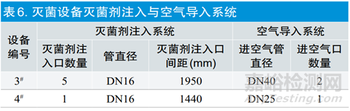 分別對(duì)兩臺(tái)滅菌設(shè)備的滅菌劑注入管路、滅菌劑注入點(diǎn)位進(jìn)行對(duì)比,系統(tǒng)配置信息詳見表6。兩臺(tái)設(shè)備的滅菌劑注入管路均采用Φ8mm紫銅管,能夠保證高壓液態(tài)混合氣體的流量基本穩(wěn)定且充分氣化、經(jīng)過(guò)氣化器后為直徑DN16的不銹鋼管。兩臺(tái)設(shè)備滅菌劑加注口間距在1440~1950mm,每個(gè)滅菌劑加注口所覆蓋的空間相差不大,則滅菌劑進(jìn)入產(chǎn)品的分布路徑基本一致。滅菌劑注入、空氣導(dǎo)入的點(diǎn)位數(shù)量和管道直徑均按不同容積進(jìn)行匹配,每個(gè)加注口的間距及所覆蓋的范圍和導(dǎo)入空氣點(diǎn)位的速率也比較接近。