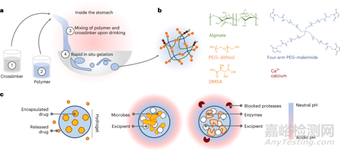 由于停留時(shí)間相對(duì)較短(<30min)和胃液的復(fù)雜性,研究者開發(fā)了能夠快速而有力地交聯(lián)兩個(gè)互穿聚合物網(wǎng)絡(luò)的交聯(lián)化學(xué)物質(zhì)。最終確定方案:(1)攝入包含CaCl2和DMSA或PEG-二硫醇的交聯(lián)劑溶液;(2)然后,攝入包含藻酸鹽和四臂PEG-馬來(lái)酰亞胺的聚合物溶液;(3)在胃中混合,聚合物溶液經(jīng)歷聚合物網(wǎng)絡(luò)的交聯(lián)和凝膠化;(4)形成LIFT水凝膠(圖1a、b)。