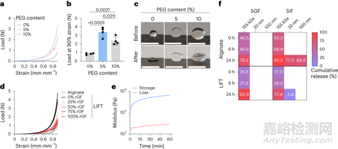 通過(guò)壓縮測(cè)試對(duì)所得水凝膠進(jìn)行了機(jī)械表征。與藻酸鹽水凝膠相比,LIFT水凝膠承受的負(fù)載明顯更大(圖2a,b)。在90%應(yīng)變后,LIFT水凝膠大部分保持球形,而藻酸鹽水凝膠保持永久變形(圖2c)。通過(guò)循環(huán)壓縮測(cè)試對(duì)LIFT水凝膠進(jìn)行了進(jìn)一步的機(jī)械表征。LIFT水凝膠可以維持90%應(yīng)變的至少五個(gè)循環(huán),但藻酸鹽水凝膠在一個(gè)循環(huán)后仍保持永久變形,無(wú)法維持隨后的應(yīng)變。為了測(cè)試LIFT水凝膠在體內(nèi)形成的能力,在水中以各種稀釋度在新鮮豬胃液中形成水凝膠。圖2d顯示,雖然胃液削弱了LIFT水凝膠的機(jī)械性能,但這些水凝膠比在理想條件下形成的藻酸鹽水凝膠在機(jī)械上更堅(jiān)韌??傊?,這些數(shù)據(jù)表明,LIFT水凝膠即使在胃液中也能快速形成,所得水凝膠具有機(jī)械韌性,DMSA和PEG-二硫醇交聯(lián)劑都能交聯(lián)共價(jià)PEG網(wǎng)絡(luò),且水凝膠組分具有生物相容性。
