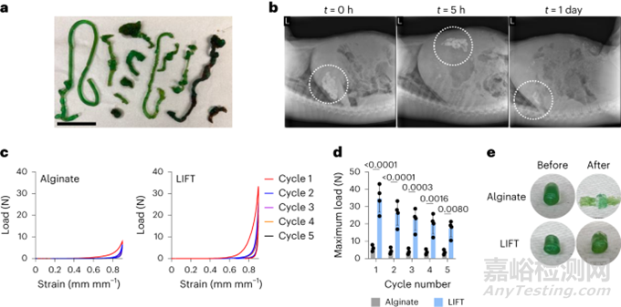 在體內(nèi)測(cè)試LIFT水凝膠的形成、動(dòng)力學(xué)和安全性。由于豬的胃腸道大小與人類相似,選擇豬模型。通過(guò)內(nèi)窺鏡,將交聯(lián)劑和聚合物溶液注入豬胃中,并觀察到5-8h后水凝膠結(jié)構(gòu)。無(wú)論給藥順序如何,水凝膠都會(huì)在胃里形成。先交聯(lián)劑,后聚合物溶液,胃內(nèi)可重復(fù)形成面條狀水凝膠;順序相反,則產(chǎn)生了更大但不太連續(xù)的塊狀水凝膠(圖3a)。因此,選擇先給藥交聯(lián)劑,再給藥聚合物溶液,在體內(nèi)形成LIFT水凝膠。然后通過(guò)X射線成像研究LIFT水凝膠的體內(nèi)傳輸時(shí)間。一般來(lái)說(shuō),LIFT水凝膠給藥后在胃內(nèi)停留24h(圖3b);相比之下,禁食和進(jìn)食狀態(tài)下0.4-1.4h從豬胃中排空液體。給藥后48h,未觀察到肝或腎功能變化。這些數(shù)據(jù)支持LIFT水凝膠及其成分被安全清除,不會(huì)造成阻塞,也不會(huì)造成毒性。在胃腔中形成后,通過(guò)循環(huán)壓縮測(cè)試表征LIFT水凝膠的機(jī)械性能。圖3c-e 顯示,LIFT水凝膠更堅(jiān)韌,能夠維持至少五個(gè)90%的循環(huán)菌株,而藻酸鹽水凝膠在一個(gè)循環(huán)后保持平坦。這些強(qiáng)調(diào)了LIFT水凝膠在人體胃腸道口服給藥后在胃中牢固形成的能力。