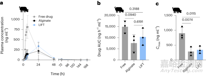 在確定LIFT水凝膠可以在體內(nèi)形成后,又評(píng)估了它們封裝和調(diào)節(jié)小分子釋放的能力。選擇流明三烯作為模型小分子藥物,將形成藥物懸浮液,后被封裝在水凝膠內(nèi)。游離流明三烯的血漿濃度峰值在給藥后5-7h,水凝膠(藻酸鹽和LIFT)制劑的血漿藥物濃度峰值為~24h(圖4a)。游離藥物、藻酸鹽和LIFT水凝膠的釋放藥物的曲線下面積(AUC)分別為14873.5±2719.2, 7568.4±3780.6和10337.5±3849.7ng?h-1?ml-1,并且沒有統(tǒng)計(jì)學(xué)差異(圖4b)。雖然藥物AUCs沒有差異,但最大藥物濃度(Cmax)明顯更高,游離藥物(901.2±197.1ng?h-1?ml-1)、藻酸鹽(283.8±147.3ng?h-1?ml-1)、LIFT水凝膠(338.7±122.6ng?h-1?ml-1)(圖4c)。這些數(shù)據(jù)證明LIFT水凝膠在較低血漿濃度下提供與游離藥物相當(dāng)?shù)目倓┝克幬锏哪芰?,可以降低藥物毒性?/span>