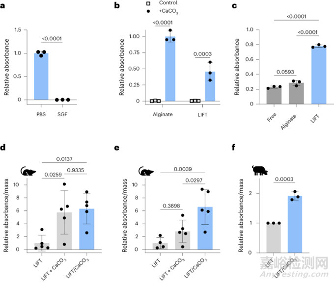 接下來(lái),評(píng)估了LIFT水凝膠口服遞送酶的能力,選擇β-半乳糖苷酶(乳糖酶)。與磷酸鹽緩沖鹽水(PBS)相比,在SGF中孵育時(shí)乳糖酶活性顯著降低(圖5a);然后將乳糖酶與CaCO3一起包封在藻酸鹽或LIFT水凝膠中作為賦形劑以中和酸性胃液。當(dāng)用SGF攻擊時(shí),含有CaCO3的水凝膠保持了乳糖酶活性(圖5b),強(qiáng)調(diào)了LIFT水凝膠與酶的兼容性。除了酸性胃液外,胃腸道中還富含可以降解酶的蛋白酶。與游離乳糖酶或藻酸鹽水凝膠中包埋乳糖酶相比,LIFT水凝膠表現(xiàn)出最大的乳糖酶活性保護(hù)作用(圖5c)。因此,除了共包封CaCO3外, LIFT水凝膠可能對(duì)蛋白酶表現(xiàn)出額外的屏障。