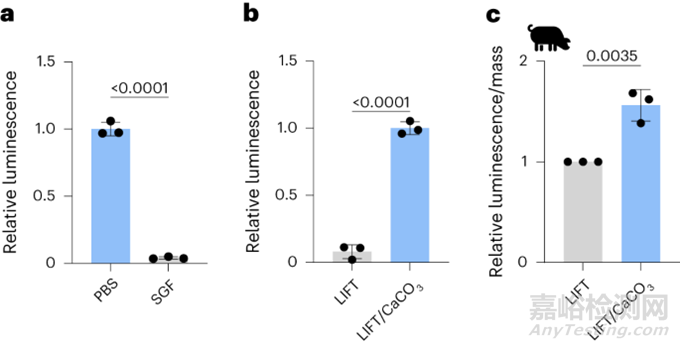 研究者使用發(fā)光ATP定量測(cè)定法以考察細(xì)菌(乳酸桿菌)的生存能力。乳酸桿菌在短時(shí)間暴露于SGF pH=1.77后表現(xiàn)出生存能力下降(圖6a),當(dāng)與CaCO3共封裝在LIFT中時(shí),這種情況得到了緩解(圖6b)。在豬胃內(nèi)給藥6-7h后,與對(duì)照相比,在LIFT內(nèi)與CaCO3共包封的乳酸桿菌表現(xiàn)出更大的活力(圖6c)。用大腸桿菌Nissle 1917(EcN)進(jìn)行了類似的實(shí)驗(yàn),但沒有表現(xiàn)出統(tǒng)計(jì)學(xué)意義。EcN和乳酸桿菌之間的差異可能是由于后者對(duì)與胃酸相關(guān)的pH范圍更敏感。因此,當(dāng)體內(nèi)負(fù)載CaCO3時(shí),LIFT水凝膠能夠支持細(xì)菌活力并防止酸侵蝕。