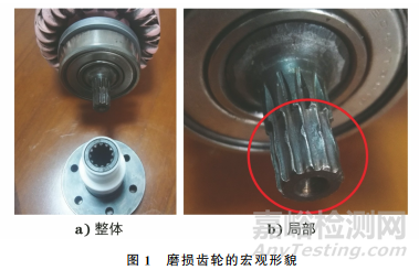 對磨損齒輪進行宏觀觀察,結(jié)果如圖1所示,可以發(fā)現(xiàn)齒輪與齒輪軸套接觸部位的齒牙大部分磨損消失,齒牙中間區(qū)域殘留較多。