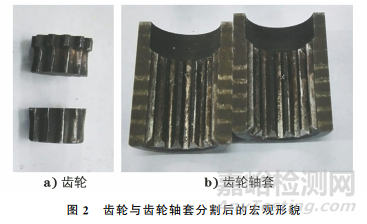 將齒輪和配套使用的齒輪軸套進行分割,分割后兩者的宏觀形貌如圖2所示,可見齒輪軸套的齒牙相對完整,除個別齒牙尖角處有擠壓痕跡,其他部位完好無損。