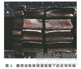利用體視顯微鏡對磨損齒輪進行宏觀觀察,結(jié)果如圖3所示,齒輪表面呈現(xiàn)金屬氧化后的顏色,齒牙外表面大部分磨損消失。