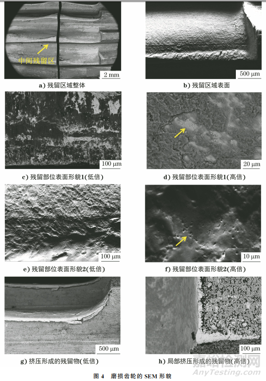 將分割后的齒輪置于掃描電鏡下觀察,結(jié)果如圖4所示。由圖4可知:齒輪大部分磨損消失,齒輪齒牙中間區(qū)域殘留較多;殘留區(qū)域表面可見擠壓、摩擦形成的具有一定方向性的痕跡,表面大部分被金屬粉末或氧化物覆蓋,可見較多細小的顆粒,裸露出的金屬表面存在細小壓痕或孔洞;齒輪殘留部位局部可見擠壓形成的殘留物。齒輪與齒輪軸套之間存在磨粒磨損的痕跡,磨粒磨損是當摩擦副一方表面存在堅硬的細微凸起,或在接觸面之間存在硬質(zhì)粒子時產(chǎn)生的一種磨損。