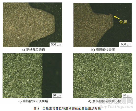 分別在垂直于齒輪軸向方向的正常 部位和磨損部位(中間保留較多的部位)取樣,將試樣進行鑲嵌、磨拋、腐蝕處理,然后置于光學(xué)顯微鏡下觀察,結(jié)果如圖5所示。由圖5可知:正常部位與磨損部位齒牙截面的顯微組織均未見疏松、夾雜等冶金缺陷,兩者顯微組織無明顯差別;磨損部位的齒牙已部分消失,且邊緣有擠壓磨削殘留的余屑;磨損部位齒牙表面和心部的顯微組織均為回火馬氏體。