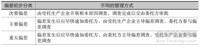 如果是受托生產(chǎn)企業(yè)發(fā)生了偏差,也建議基于不同偏差分類來(lái)與委托方協(xié)商共同管理好偏差的方法,表1 提供了一種可以參考的方法。