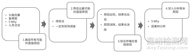 在開(kāi)展偏差根本原因調(diào)查過(guò)程中,最重要的是要梳理清楚分析的思路,避免人為臆測(cè)原因。對(duì)此,筆者推薦一種結(jié)構(gòu)化的方法:偏差根本原因分析四步法(如圖2 所示),其具體思路如下: