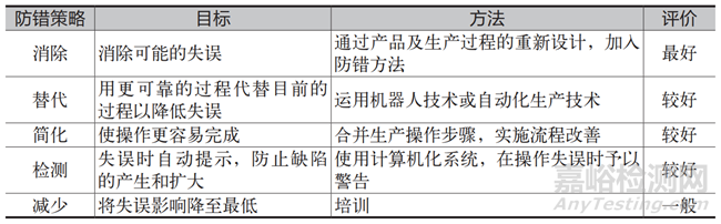 在制定糾正措施與預(yù)防措施的策略上,不同防錯(cuò)策略所達(dá)到的效果也會(huì)不同,建議優(yōu)先選擇消除、替代、簡(jiǎn)化和檢測(cè),表3 比較了不同防錯(cuò)策略的效果。