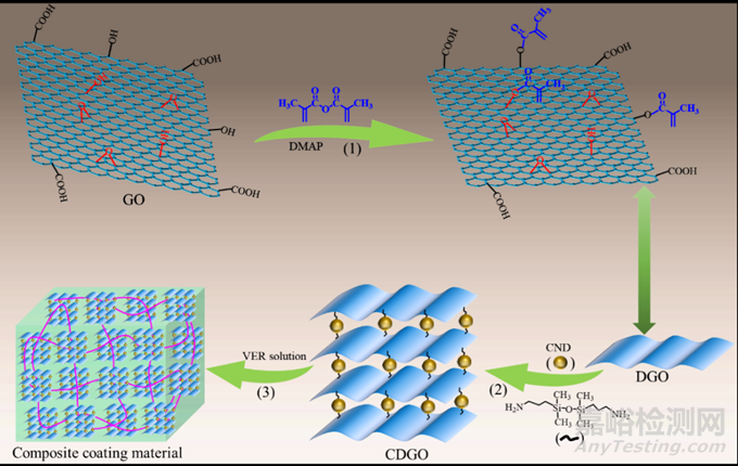 該工作首先采用丙烯酸和10-十一烯酸對環(huán)氧樹脂E44進行開環(huán)反應(yīng),得到具有雙鍵封端的VER樹脂(如圖1),隨后以有機硅為“橋”將氧化的納米金剛石(如圖2)接枝到改性的GO上(如圖3(2)),最后將多重改性的GO分散到VER樹脂中,在加熱條件下制備復(fù)合防腐涂層。