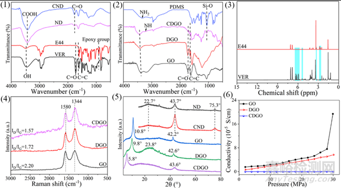 圖4. ND、CND、E44和VER的FTIR譜圖(1);PDMS、CDGO、DGO和GO的FTIR譜圖(2);E44和VER的1H-NMR譜圖(3);GO、DGO和CDGO的拉曼光譜圖(4);ND、CND、GO、DGO和CDGO的XRD譜圖(5);GO、DGO和CDGO的電導(dǎo)率和壓強的關(guān)系曲線(6)