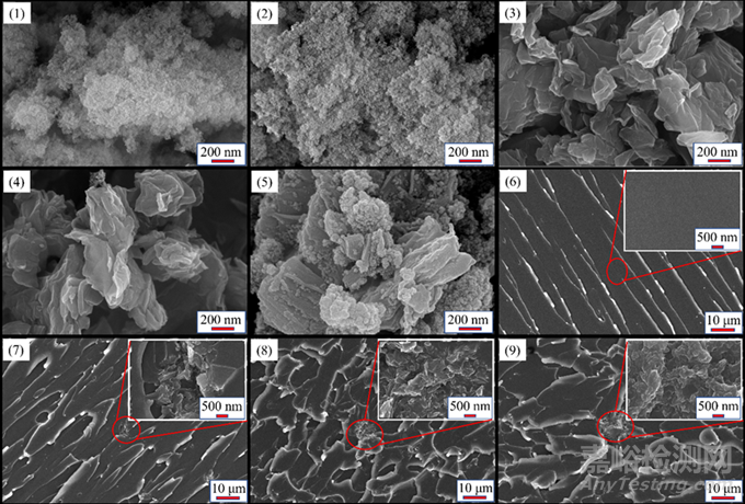 圖5. ND(1)、CND(2)、GO(3)、DGO(5)和CDGO(5)的SEM形貌圖;VER(6)、VER-GO(7)、VER-DGO(8)和VER-CDGO(9)的SEM截面形貌圖