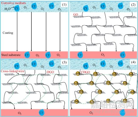 氧化石墨烯(GO)具有豐富的含氧官能團,易于對其進行共價和非共價改性,而且GO具有優(yōu)異的物理阻隔能力,其在提高涂層耐腐蝕性方面展現(xiàn)出巨大的應(yīng)用前景。遺憾的是,GO具有較強的范德華力和π-π相互作用,使其易于發(fā)生自聚集現(xiàn)象,導(dǎo)致GO的“迷宮效應(yīng)”無法得到充分發(fā)揮,而且GO還具有一定的導(dǎo)電性,在涂層產(chǎn)生缺陷時容易發(fā)生局部電偶腐蝕,進而加速金屬腐蝕。另外,在制備涂層的過程中,由于溶劑的揮發(fā)和不合理的固化方式,導(dǎo)致涂層容易產(chǎn)生微孔、微裂紋等缺陷,以上因素對涂層的長效防腐能力來說都是不利的。