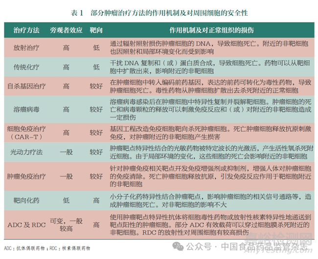 靶向藥物的開(kāi)發(fā)針對(duì)藥物對(duì)正常細(xì)胞的安全風(fēng)險(xiǎn)作出革命性的改變,加強(qiáng)了藥物對(duì)靶向細(xì)胞的選擇性,提高了藥物的治療窗(therapeutic window)。靶向治療策略在多種治療方法中的應(yīng)用及發(fā)展,使醫(yī)療實(shí)現(xiàn)跨越式的進(jìn)步。表1總結(jié)了部分腫瘤治療方法的作用機(jī)制及對(duì)周圍細(xì)胞的安全性,分析了藥物對(duì)正常組織的損傷。