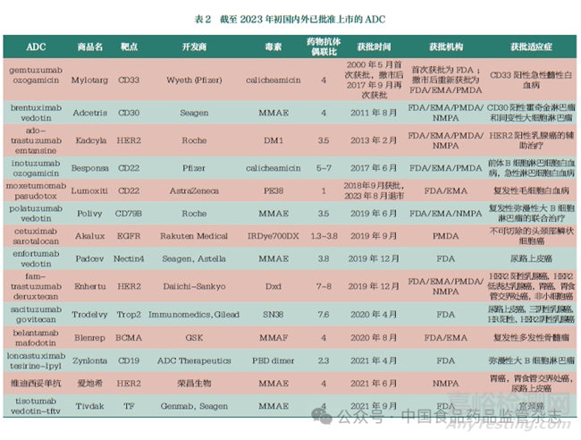 靶向治療藥物開(kāi)發(fā)中非常值得關(guān)注的是結(jié)合腫瘤靶點(diǎn)抗原的特異性抗體和小分子細(xì)胞毒性藥物共同組成的ADC。ADC是一種靶向治療癌癥的藥物,它將特異性結(jié)合腫瘤抗原的抗體作為制導(dǎo)成分,以殺死腫瘤細(xì)胞的強(qiáng)效毒素作為效應(yīng)彈頭,組成高效靶向生物導(dǎo)彈??贵w將彈頭直接引導(dǎo)到腫瘤細(xì)胞,避免進(jìn)入非靶細(xì)胞以減少不良反應(yīng)。至2023年,已有超過(guò)15種ADC被批準(zhǔn)用于治療癌癥,還有多種ADC正在進(jìn)行臨床試驗(yàn)。表2是目前上市的ADC簡(jiǎn)介。