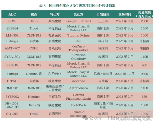 ADC近年來(lái)在我國(guó)的開(kāi)發(fā)異常火熱。表3列出了部分有國(guó)內(nèi)外轉(zhuǎn)讓權(quán)益的ADC研發(fā)項(xiàng)目,可以客觀地反映國(guó)內(nèi)藥企在這一研發(fā)領(lǐng)域的生命力,也體現(xiàn)了我國(guó)生物醫(yī)藥的創(chuàng)新活力和對(duì)世界新藥研發(fā)的重要貢獻(xiàn)。