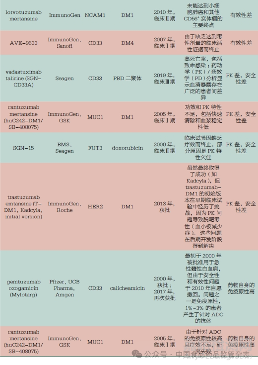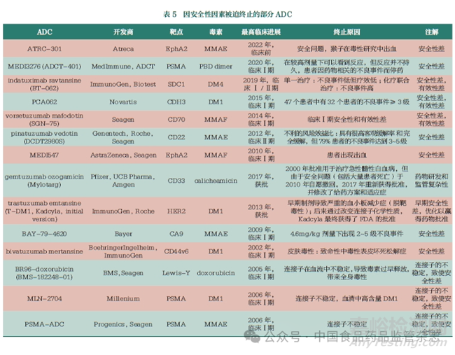 安全性原因主要指ADC自身的不可耐受的毒性限制了患者用藥。其中ADC的靶向性和連接子毒素的穩(wěn)定性等對(duì)安全性影響較大,無(wú)論是靶向非腫瘤細(xì)胞還是毒素的非特異性釋放都會(huì)帶來(lái)嚴(yán)重的毒性問(wèn)題。表5展示了部分因安全性因素被迫終止的ADC。
