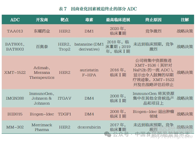 除安全性和有效性之外,商業(yè)化因素也左右著ADC的臨床走向。表7展示了因商業(yè)化因素被迫終止的部分ADC,這些均與市場(chǎng)競(jìng)爭(zhēng)環(huán)境及企業(yè)的戰(zhàn)略調(diào)整等原因相關(guān)。