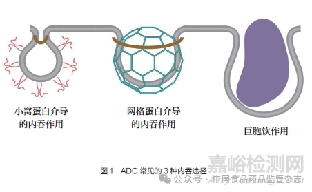 部分ADC也可以通過(guò)巨胞飲作用進(jìn)入細(xì)胞內(nèi),該作用是細(xì)胞對(duì)胞外大分子物質(zhì)的一種非特異性的內(nèi)吞作用[11]。例如,Jedema等[12]報(bào)道治療急性髓性白血病的ADC gemtuzumab ozogamicin(CD33靶向)存在2種內(nèi)吞途徑,在低濃度時(shí)通過(guò)與細(xì)胞表面的CD33結(jié)合啟動(dòng)網(wǎng)格蛋白介導(dǎo)的內(nèi)吞,而在高濃度時(shí)通過(guò)巨胞飲作用進(jìn)入CD33陰性細(xì)胞,這2種內(nèi)吞途徑都能釋放有效載荷阻斷DNA復(fù)制,影響細(xì)胞周期,導(dǎo)致細(xì)胞死亡。但巨胞飲作用作為一種非特異性的內(nèi)吞作用,往往與不良反應(yīng)相關(guān),例如,臨床中觀察到的gemtuzumab ozogamicin肝毒性可能與肝臟中存在大量具有巨胞飲作用細(xì)胞有關(guān)。