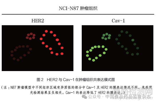 研究表明,Cav-1與HER2共定位于細(xì)胞膜凹陷結(jié)構(gòu),影響HER2在癌細(xì)胞膜上的表達(dá)和穩(wěn)定性。HER2的表達(dá)與Cav-1呈負(fù)相關(guān),Cav-1高表達(dá)的細(xì)胞HER2膜表達(dá)低,且傾向于胞內(nèi)積聚(圖2),在體內(nèi)腫瘤模型如NCI-N87異種移植瘤中可以發(fā)現(xiàn)這樣的負(fù)相關(guān)表達(dá)區(qū)域。在異質(zhì)性較高的患者腫瘤組織中,Cav-1高表達(dá)造成腫瘤細(xì)胞膜HER2低表達(dá),會(huì)影響腫瘤組織對(duì)HER2藥物的臨床療效。HER2和Cav-1的逆向調(diào)節(jié)及對(duì)抗HER2藥物的影響已在動(dòng)物實(shí)驗(yàn)中證明,抗脂類代謝藥物lovastatin通過(guò)抑制Cav-1表達(dá),可以提高腫瘤細(xì)胞HER2的膜表達(dá),并進(jìn)而增強(qiáng)T-DM1的抗腫瘤藥效[9-10]。以上發(fā)現(xiàn)具有一定的臨床指導(dǎo)意義,或許可以通過(guò)與lovastatin等膽固醇類藥物聯(lián)用治療HER2低表達(dá)或T-DM1耐藥患者。