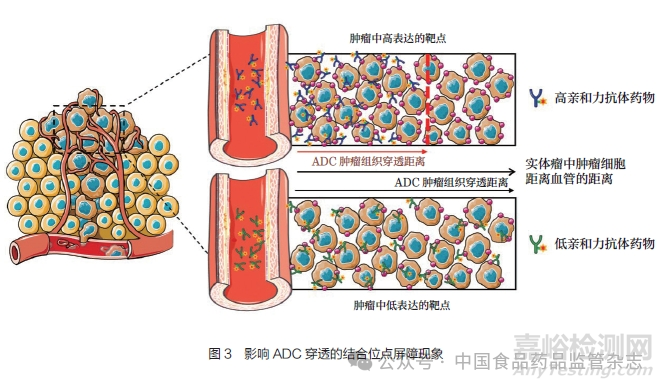 ADC作為一種靶向殺傷腫瘤的抗體藥物已越來(lái)越受到關(guān)注,但是在臨床實(shí)踐中,ADC的療效受到多種因素的制約。例如,在實(shí)體腫瘤的治療中,ADC面臨的另一個(gè)難題就是藥物在腫瘤組織滲透中的結(jié)合位點(diǎn)屏障(binding-site barrier,BSB)。當(dāng)ADC從血管進(jìn)入實(shí)體瘤組織中,高親和力的抗體通常會(huì)緊密結(jié)合在血管周圍的實(shí)體瘤細(xì)胞,難以向腫瘤內(nèi)部滲透,導(dǎo)致ADC僅對(duì)血管周圍表層細(xì)胞進(jìn)行殺傷而難以進(jìn)入實(shí)體瘤核心(圖3),從而影響藥效[13-14]。從圖3可以看出,抗體的親和力及靶點(diǎn)的分布情況均會(huì)影響ADC的腫瘤組織穿透,因此在選擇ADC抗體時(shí)需要結(jié)合靶點(diǎn)的具體情況對(duì)抗體結(jié)合的親和動(dòng)力學(xué)作擇優(yōu)比較,才能保證ADC有較好的腫瘤組織穿透能力和藥效。理論上,增大給藥劑量在一定程度上能解決滲透性差的問(wèn)題,但對(duì)于ADC來(lái)說(shuō),藥物毒性限制了給藥劑量,因此增大劑量的方法不適用。這里主要介紹2種增強(qiáng)ADC腫瘤組織滲透的方法:ADC與其對(duì)應(yīng)的裸抗體聯(lián)合給藥[14];ADC與即時(shí)競(jìng)爭(zhēng)抑制性抗體聯(lián)合給藥[15]。