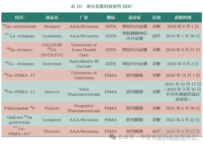 放射性藥物的開(kāi)發(fā)已有較長(zhǎng)歷史,早期獲批的放射性藥物大多是非靶向性藥物,利用放射性同位素本身的體內(nèi)富集特點(diǎn)對(duì)患者進(jìn)行治療,同時(shí)會(huì)殺傷正常細(xì)胞,不良反應(yīng)較大。能夠?qū)崿F(xiàn)對(duì)目標(biāo)病灶進(jìn)行靶向性殺傷的靶向放射性藥物研究,近幾年也取得了較好的進(jìn)展(表10)。其中,Lutathera、Pluvicto等靶向放射性藥物的獲批,極大地推動(dòng)了放射性藥物精準(zhǔn)靶向發(fā)展的步伐。