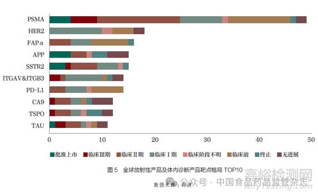 目前在研藥物靶點(diǎn)除了對(duì)標(biāo)SSTR和PSMA,還有實(shí)體瘤常見(jiàn)靶點(diǎn)如PD-L1、HER2(圖5),其中靶向PD-L1的RDC讓人非常感興趣。眾所周知,放療可以誘導(dǎo)免疫反應(yīng),促進(jìn)免疫細(xì)胞進(jìn)入腫瘤,但放療后腫瘤可能出現(xiàn)PD-L1上調(diào)而削弱抗腫瘤免疫,因此靶向PD-L1的RDC或許能使免疫治療不敏感的“冷”腫瘤變“熱”,前景讓人期待。