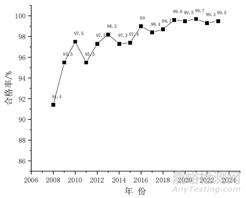 圖 1 國(guó)家藥品抽檢中成藥標(biāo)準(zhǔn)檢驗(yàn)整體合格率