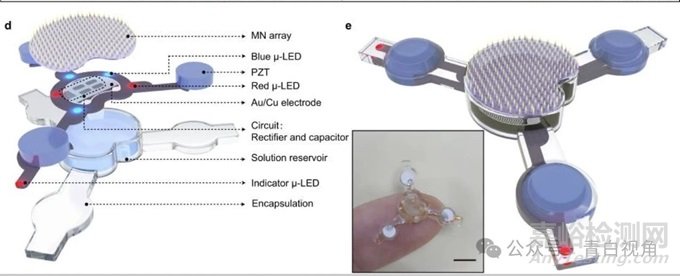 以下圖1d描述了眼貼片的結(jié)構(gòu)組成。它包括壓電傳感器、電化學(xué)微致動器、藥物微針陣列、μ-LED、柔性電路和生物兼容封裝。
