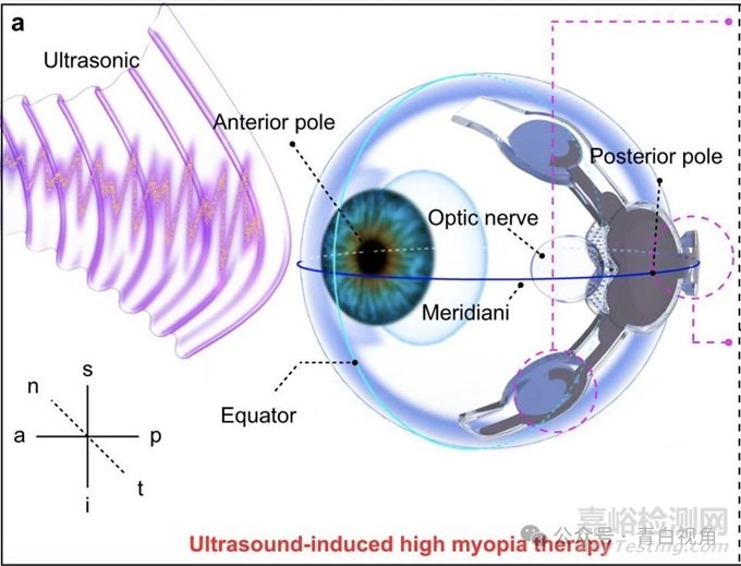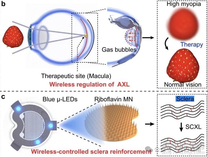 該研究重點(diǎn)關(guān)注三個關(guān)鍵領(lǐng)域:無線超聲調(diào)制、高度近視治療和鞏膜核黃素微針?biāo)幬锞忈?。與傳統(tǒng)眼科手術(shù)相比,眼部調(diào)制貼片的無線超聲控制具有多種優(yōu)點(diǎn):結(jié)構(gòu)緊湊,易于植入;該設(shè)備利用無線供電,無需內(nèi)置使用笨重的有毒電池,方便外部復(fù)雜的治療步驟并簡化手術(shù);具有靈活、創(chuàng)新的微型泵,可調(diào)節(jié)眼軸長度 (AXL),該泵高效且與柔性材料兼容;該裝置還包括用于后鞏膜加固的藥物遞送系統(tǒng),降低手術(shù)復(fù)雜性并提高藥物遞送效率;尤其是作為侵入性較小的體外操作治療優(yōu)勢,減少了術(shù)中暴露的需要,縮短了手術(shù)時間,并簡化了整體治療。該技術(shù)通過超聲波實(shí)現(xiàn)精確的 AXL 調(diào)節(jié)和 SCXL 性能,提高治療準(zhǔn)確性并減少重復(fù)手術(shù)的需要。該研究在兔眼中實(shí)現(xiàn)了約 1.217 毫米的平均眼軸長度調(diào)整,這可能意味著人類近視得到顯著矯正(約 2.5 D)。另外其他現(xiàn)有方案盡管矯正了屈光不正,但由于鞏膜變薄和延伸,近視仍可能復(fù)發(fā),而該創(chuàng)新方法結(jié)合了核黃素微針/藍(lán)色 μ-LED 治療進(jìn)行鞏膜交聯(lián),使鞏膜強(qiáng)度顯著增加約 387%。