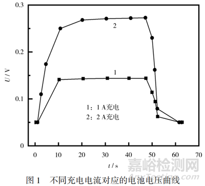 1A、2A充電過程中及停止充電后的電池電壓見圖1。從圖1可知,零電壓電池可近似看作內(nèi)部存在毛刺短路。該電池可承受1min內(nèi)2A以下電流的測(cè)試。當(dāng)充電電流為1A、2A時(shí),由于內(nèi)部存在毛刺導(dǎo)致的短路,電壓達(dá)到一個(gè)穩(wěn)定值后不再變化;當(dāng)停止充電后,電壓快速恢復(fù)到0。