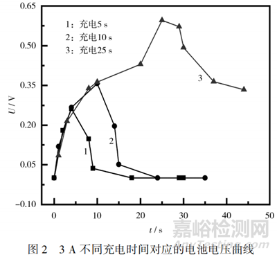 繼續(xù)增大充電電流,將充電電流改為3A,充電時(shí)間分別設(shè)置為5s、10s、25s,電池的充電測(cè)試曲線見圖2。