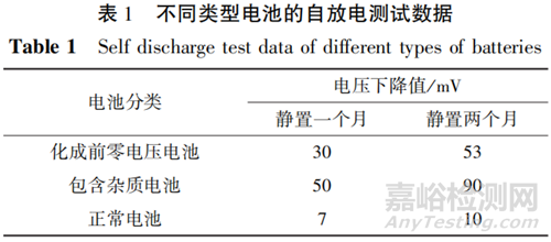 實(shí)驗(yàn)選取的電池按照1.3節(jié)化成工藝進(jìn)行充放電,步驟⑦結(jié)束后,電池荷電狀態(tài)(SOC)約為80%。在常溫下對(duì)電池進(jìn)行自放電測(cè)試,并選取正常電池和同批包含雜質(zhì)電池進(jìn)行對(duì)比,測(cè)試數(shù)據(jù)見表1。